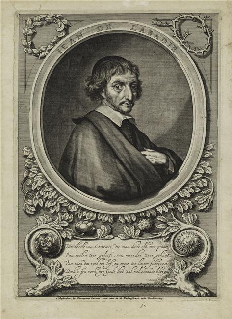 (sous le portrait, dans un cartouche) Dit’s ‘t Beelt van LABADIE, die man daar elk van praat / Van veelen teer gelieft, van meerder zeer gehaat / Van wien dat veel tot Lof, en meer tot Laster schryven / Doch is syn werk uyt Godt, het zal wel staande blyven.